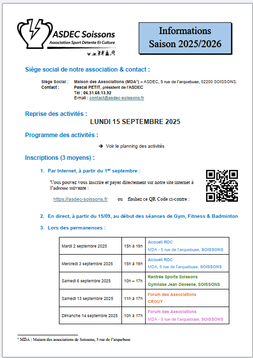 Exceptionnellement, l’activité YOGA du vendredi débutera à partir du vendredi 10 octobre ; les séances non honorées de septembre seront rattrapées plus tard dans l’année.