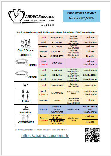 Découvrez les activités proposées par l’ASDEC, les lieux et horaires de rendez-vous. Ce planning est informel et susceptible d’évoluer en cours d’année
